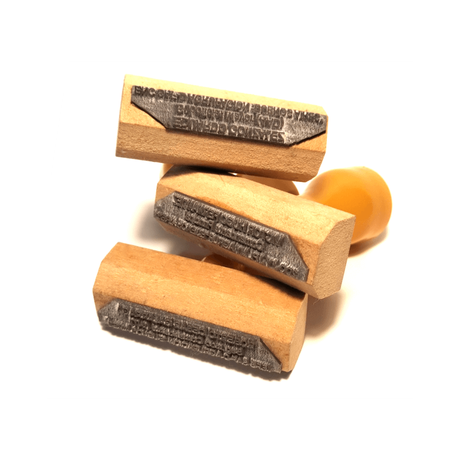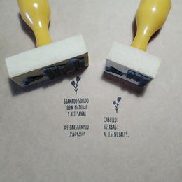 Tradicional sello de madera. Con base en MDF y perilla plástica. Vienen en muchas medidas de 3 x1 cm, hasta 9x 5 cm.